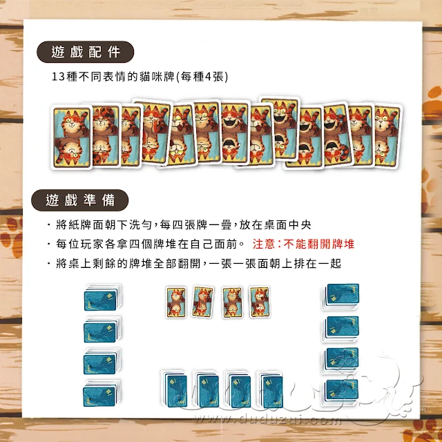 所有愛貓人都知道,每隻喵咪都有自己的脾氣,你不認同? 喵咪至少有13 種不同的表情,讓人類乖乖地屈服在牠們的魔力之下。每名玩家獲得數疊包含4張紙牌的牌疊,每張牌上喵咪的表情可能不同, 當你讓自己每疊牌中包含4張表情相同的貓咪時,立刻「喵!」一聲。遊戲結束時,得分最高的玩家獲勝,可以抱抱喵咪。